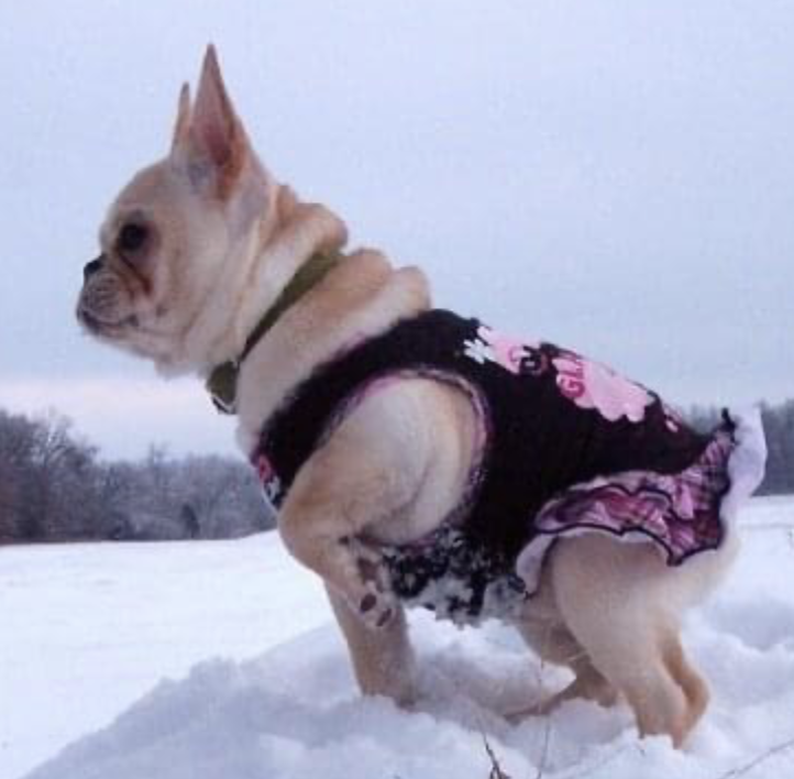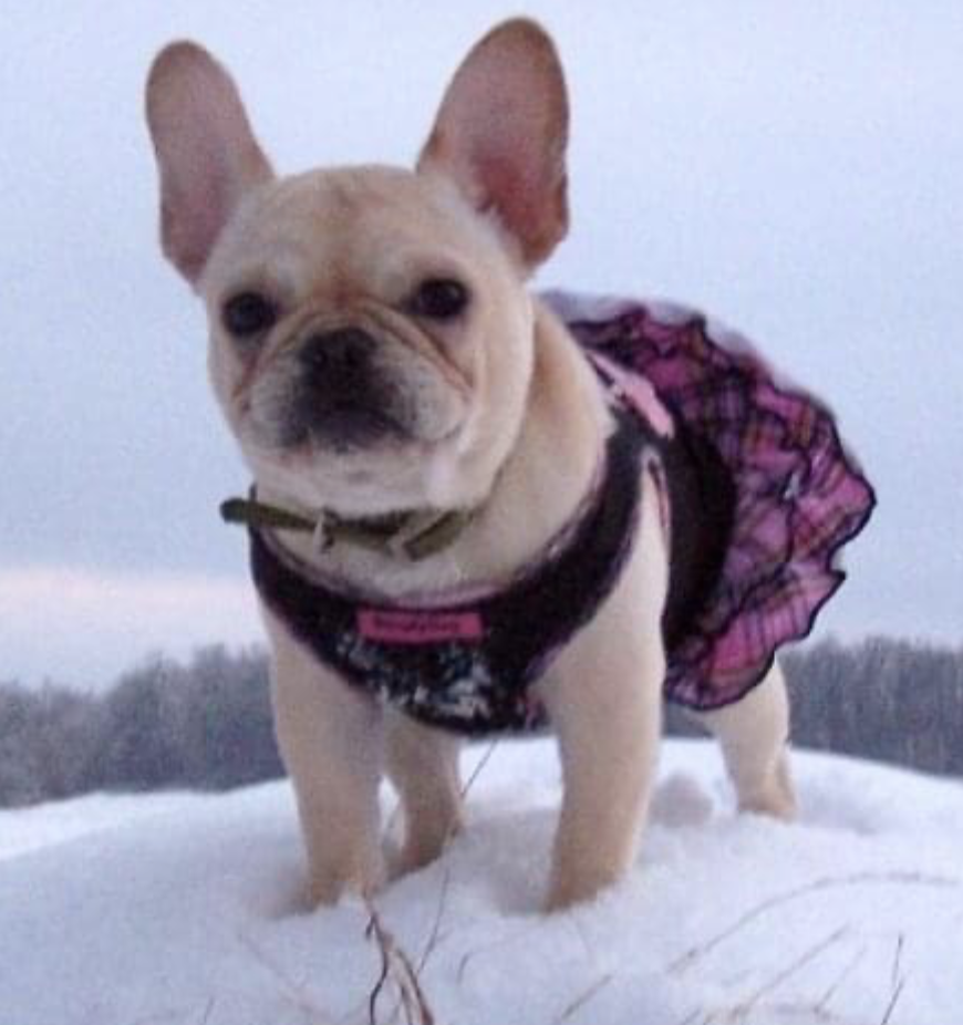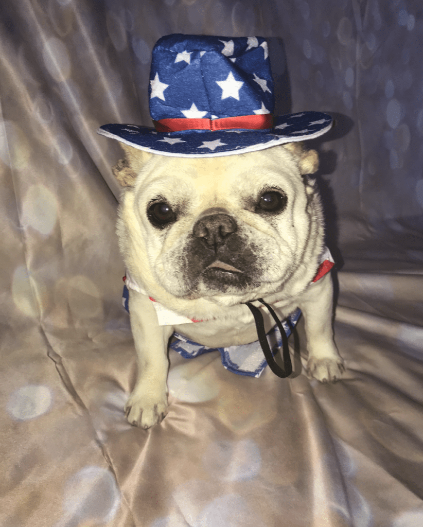 I fell in love with Paris the moment I saw her. She was the smallest one in the litter and a little pudge. A football is what she resembled. Her tongue was always sticking out and I’d say her tongue is longer than her body. Now Paris was the opposite in potty training. She was at least 8 months before being fully potty trained. I discovered that she was scared of the dark and we’d be outside for hours after the sun went down trying to pee. I can see her now. Little pudge ball with her hair staniding up on her back with her front little paw lifted and tucked under while making her best little growl bark at the slightest noise (see pic below). When I say slightest it could be the wind blowing the glass. I almost gave up on her. She must have known because all of a sudden she was potty trained. There’s little baby dressed up like a purple monkey for halloween with Darcy as a witch. I still have that witch costume and many more Frenchies have also been lucky enough to wear it.